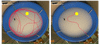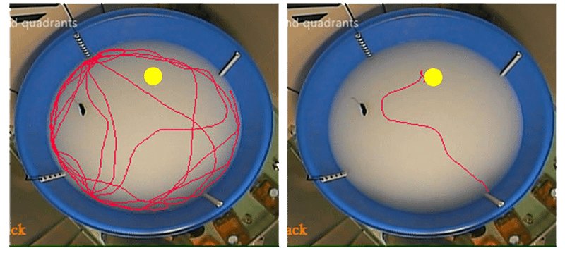 Ù「水迷宮」的實驗說明:小鼠第一天因為不知平台在何處,因此可能繞著泳池邊緣尋找逃脫出口,訓練後則可直接游往平台。(紅色線條是老鼠在泳池裡移動的軌跡,平台位在泳池中央偏上黃色圓圈)