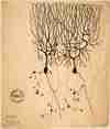 Ù神經病理學家聖地牙哥·拉蒙·卡哈自1894年手繪出第一幅神經細胞圖後,便持續投入神經細胞結構的觀察與繪圖,圖中所繪是鴿子小腦的普金斯細胞 (A) 與顆粒細胞 (B)。(圖片來源:Wikipedia, Artwork by Santiago Ramón y Cajal)