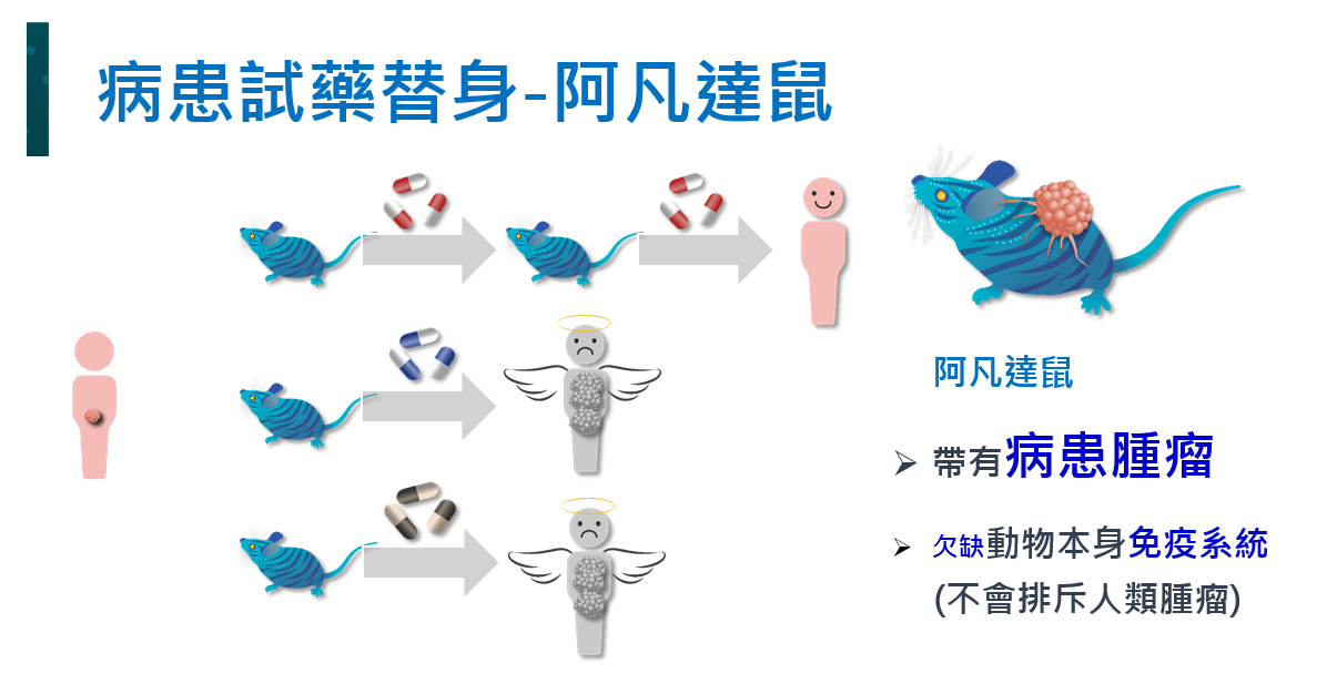 高度免疫缺乏的小鼠身上長出人類的腫瘤成為病患專屬的「阿凡達鼠」,經過病理分析及免疫組織染色確認細胞型態,能夠維持病患自身的腫瘤特性,醫師在尚未辨識確切病因時的經驗性治療期間,便能先以阿凡達鼠同時進行藥物測試,針對不同病患找到最適合的癌症治療藥物,啟了癌症藥物個人化的新時代!