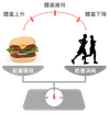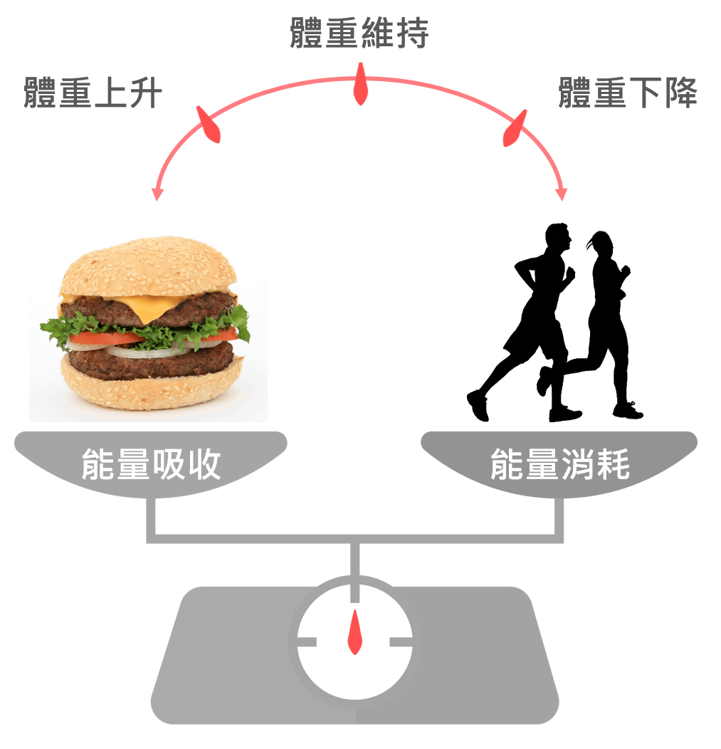 ▲目前的主流觀點認為體重的增減取決於能量天平的平衡(國研院動物中心製圖,Original images from Pixabay)