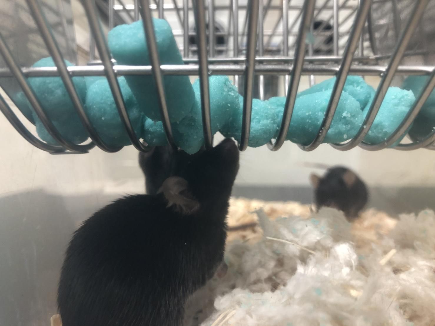 ▲實驗鼠在食用高含量脂肪飲食配方(以可食用之藍色染料作為與正常飼料之區分),雖然進食份量與一般鼠無異,但因為攝取過多的熱量,誘發肥胖產生。(照片來源:國研院動物中心)